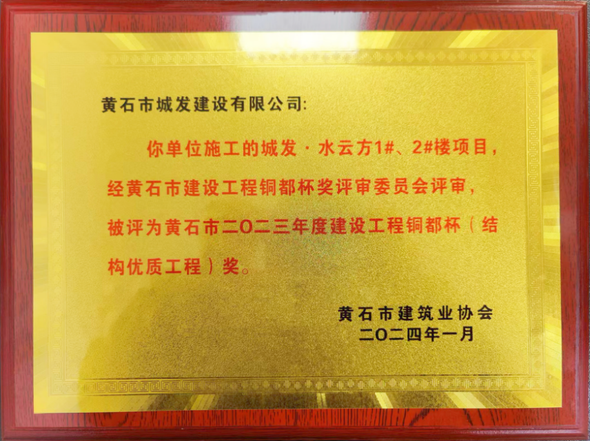近日,由黃石市城發(fā)建設有限公司承建的城發(fā)·水云方項目榮獲黃石市2023年度建設工程安全文明施工現(xiàn)場和結構優(yōu)質工程獎。
